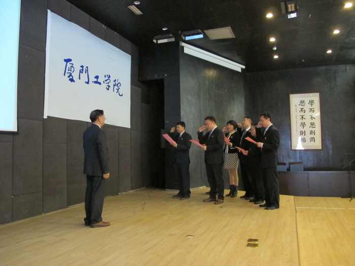 与以往人事任用程序不同的是,本次新上任的副校长及中层管理干部还进行了就职宣誓,他们走上主席台,从蔡远利校长手中接过承载着责任和使命的聘书,并在蔡校长的监誓下,进行了任职宣誓,表达了他们不辱使命、努力工作的决心。