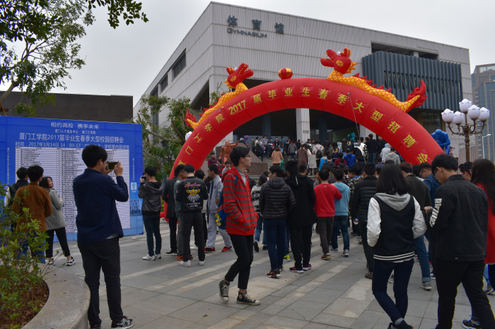 2017314下午,由我校与厦门市人才服务中心联合主办的2017届毕业生春季招聘会在体育馆举行,共吸引了126家企业前来参与,为广大毕业生提供了与企业面对面交流的机会。为了更好地了解我校毕业生的应聘情况,董事长李德文先生、校长蔡远利教授、党委书记林建华书记、副校长陈少牧教授、副校长田晓皋教授、厦门市人才服务中心陈云副部长、学工处汤伟明处长及学校各处室的负责人、辅导员等莅临现场了解企业需求,也为参加应聘的毕业生提供宝贵建议。