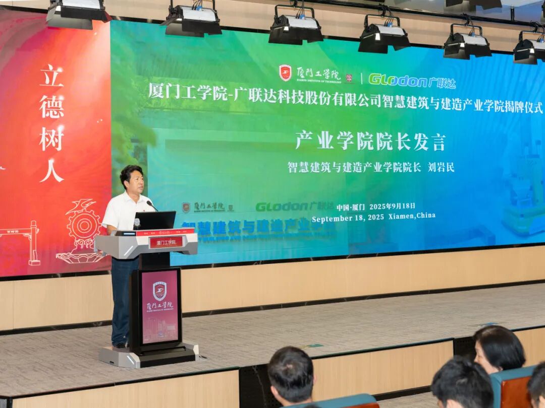 智慧建筑与建造产业学院刘岩民院长在随后的发言中从三个方面阐述了产业学院未来的规划:学院将以需求导向重塑人才培养,联合企业推行双导师制,实现“毕业即上岗、上岗即胜任”;以产教融合共建实训与研发中心,推动成果转化;以服务区域对接地方需求,提供技术与人才支持。