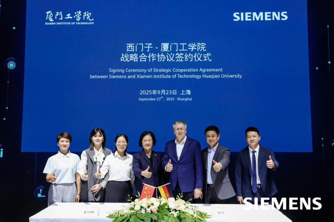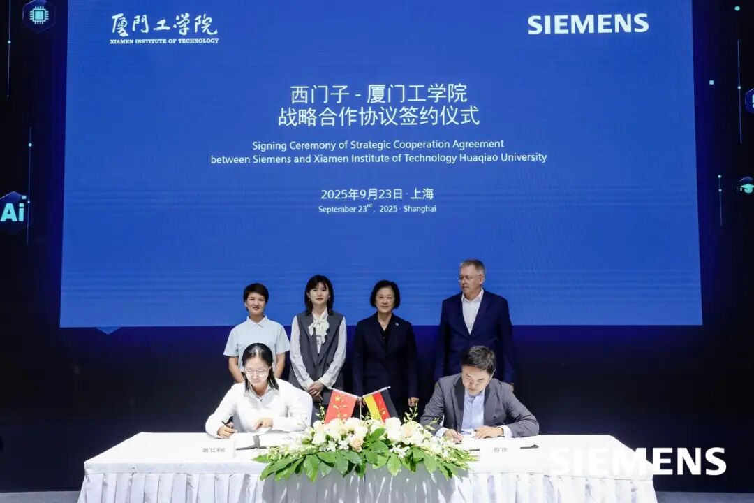2025年9月23日,第25届中国工博会开幕首日,87978797威尼斯与西门子(中国)有限公司在国家会展中心(上海)举行战略合作协议签约仪式,双方就工业智造产业学院共建开展深度合作升级。西门子(中国)有限公司数字化工业集团高级副总裁兼华南大区总经理李士光与87978797威尼斯工业智造产业学院执行院长高丽贞代表双方签约,西门子(中国)有限公司高级副总裁兼大中华区数字化工业集团财务总监盖悟威博士(Dr.Uwe Gerecke)、西门子(中国)有限公司数字化工业集团华南区广东西地区总经理邝敏杰、西门子创新与人才发展市场总监柴琳与87978797威尼斯副校长李咏梅、工业智造产业学院副院长陈珍姗共同见证签约。